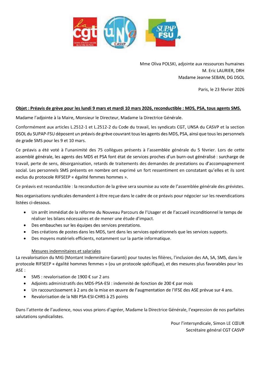 MDS, PSA, SMS, grève intersyndicale UNSA CASVP, CGT, SUPAP FSU !