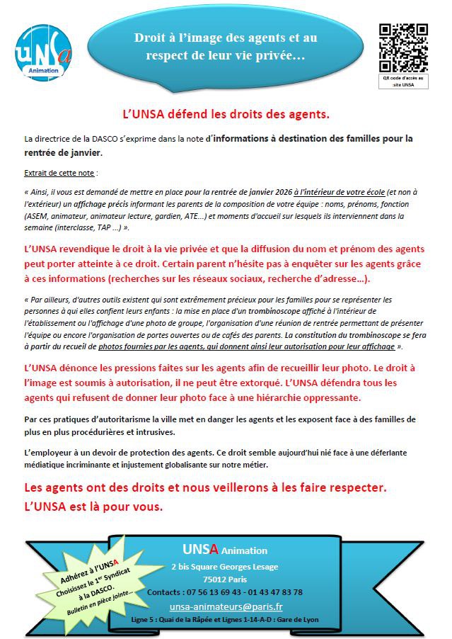 Périscolaire : identité, droit à l'image, l'UNSA défend les droits des agent-es à Paris !